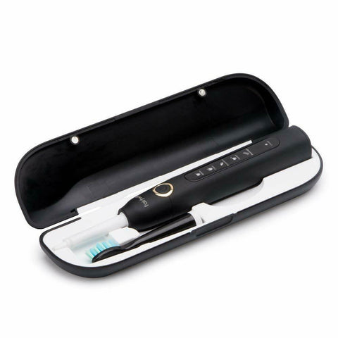 Our toothbrush comes with a matte, compact case for easy travel. The case holds two brush heads, so couples can share on the go. Keep up with your quality tooth care while you're away from home.